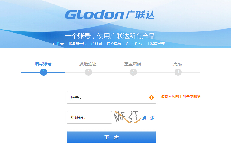 第二步:在打开的界面中,输入用户名,点击下一步通过邮箱或手机号码;如果忘记用户名,可以通过点击找回用户名,通过邮箱/手机找回用户名,再进行找回密码。 https://account.glodon.com/forgetInit